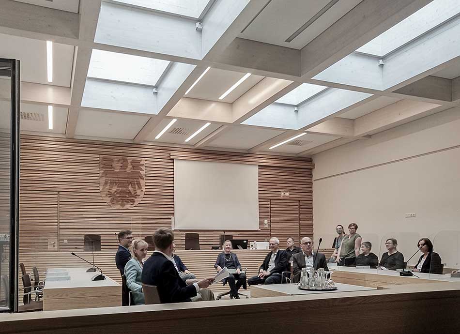 Das erste Gespräch der Reihe „Baukultur vor Ort“ — gemeinsam veranstaltet von der Architektenkammer und der Ingenieurkammer Brandenburg — fand in dem mit dem Brandenburgischen Baukulturpreis ausgezeichneten Amtsgericht Königs Wusterhausen statt.