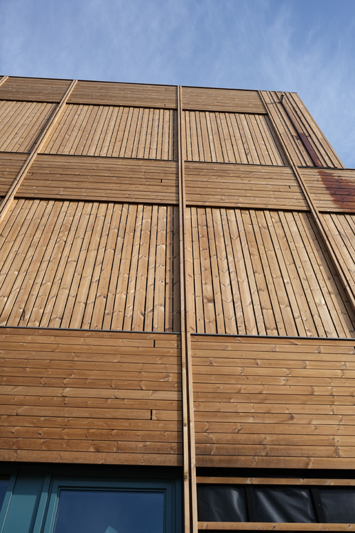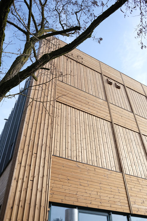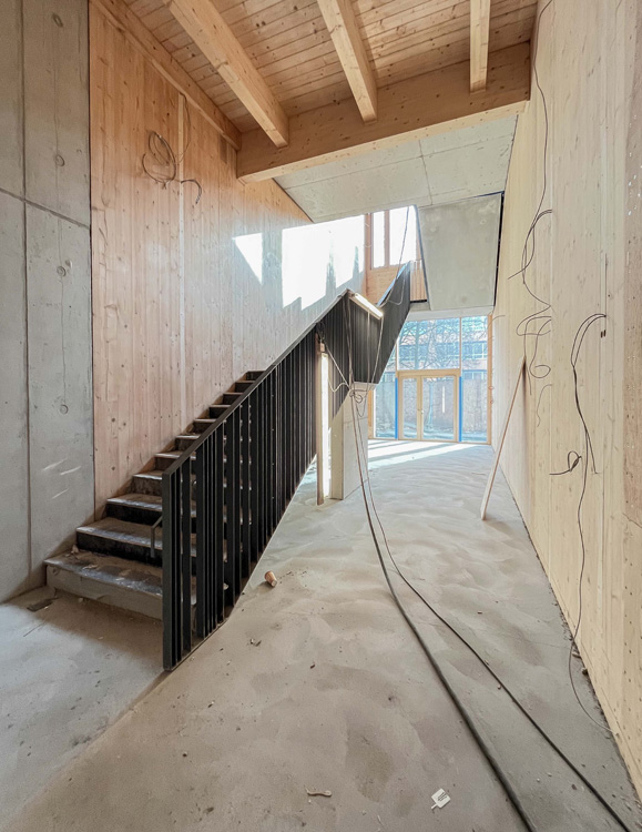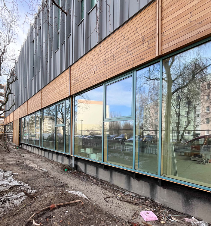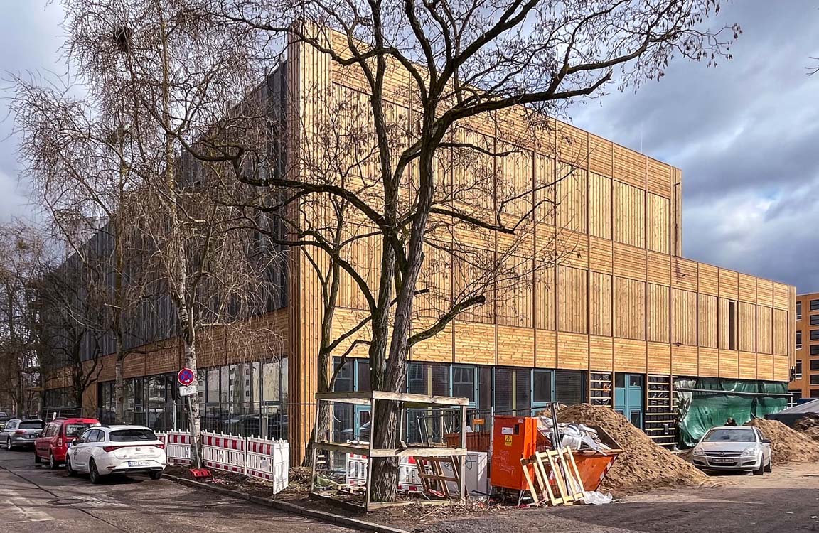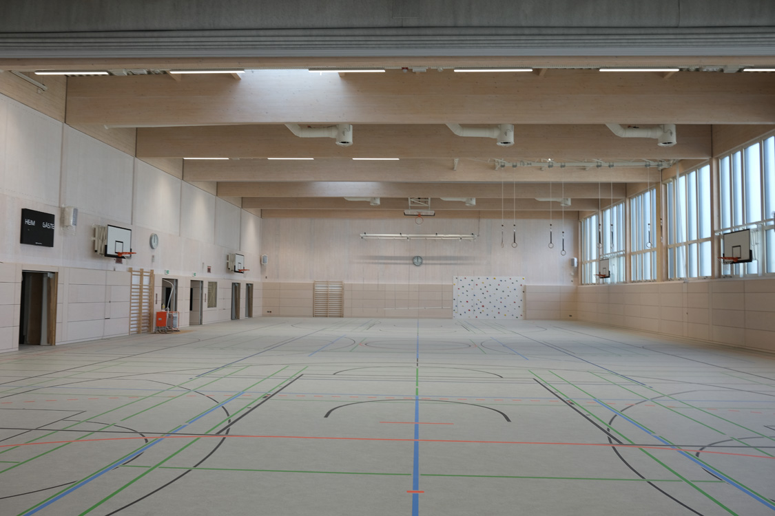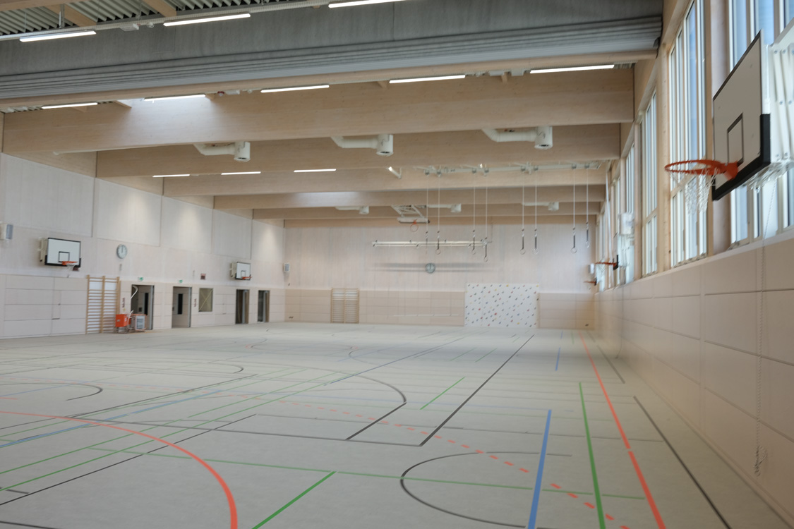 Die Eingangsfassade ist fast komplett montiert. Die Sporthalle wird eingerichtet.